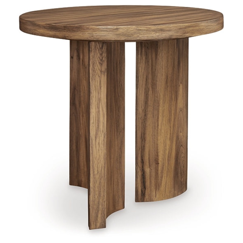 Showcasing an elevated, artistic silhouette, this end table expertly blends modern form and function. Its warm brown finish highlights the stunning wood grain, bringing an earthy element to staging a sofa-side lamp or other decor. Complete with a thick, substantial top, its a naturally beautiful living room staple in the making.