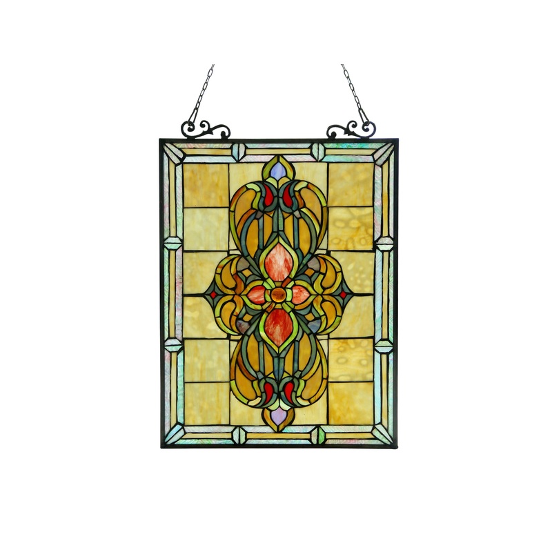 AVALON, a Victorian motif window panel, is handcrafted with quality materials of real stained glass and gem-like cabochons. Framed in antique bronze finished metal with designer anchors, makes a colorful addition to any room. -Hanging chain (included) -255