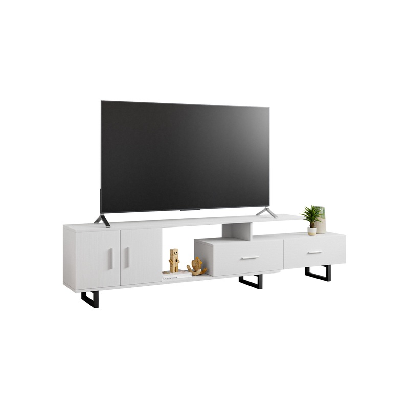 -The design includes open shelves, two spacious drawers, and a large enclosed cabinet, combining to provide flexible storage for media devices, gaming consoles, decor, and accessories.