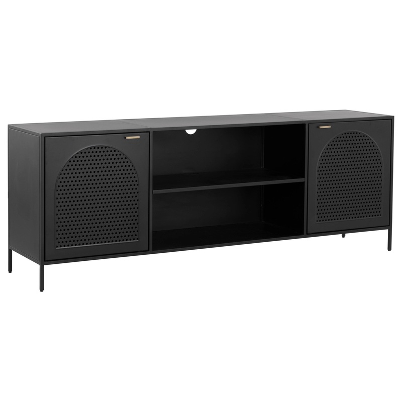 An industrial media console and cabinet with a steamlined composition. Crafted with a black metal frame and completed with brass handles. Features open shelving and two cabinets with an arched perforated metal design. Pairs well with the Aziza sideboard and nightstand. Made in India. With refined craftsmanship, this design was brought to life by skilled local artisans. By nature, these materials develop unique imperfections such as markings and colour variations for a truly one-of-a-kind piece.
