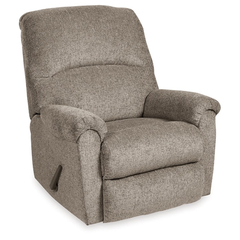 A mastery in "less is more," this rocker recliner manages to make cool, contemporary design so warm and cozy. Its soothing platinum-tone upholstery, incredibly plush to the touch, is a new twist on neutral. A curved divided back and a deeply tufted footres