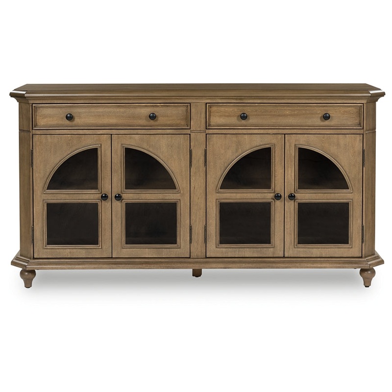 | Details | Made with wood, birch veneer and engineered wood, Light brown finish, Metal door pulls, 4 doors with arched glass panels, 2 drawers, 2 adjustable shelves, Cutouts for cord management, Minor assembly required; simply lay flat and attach feet |