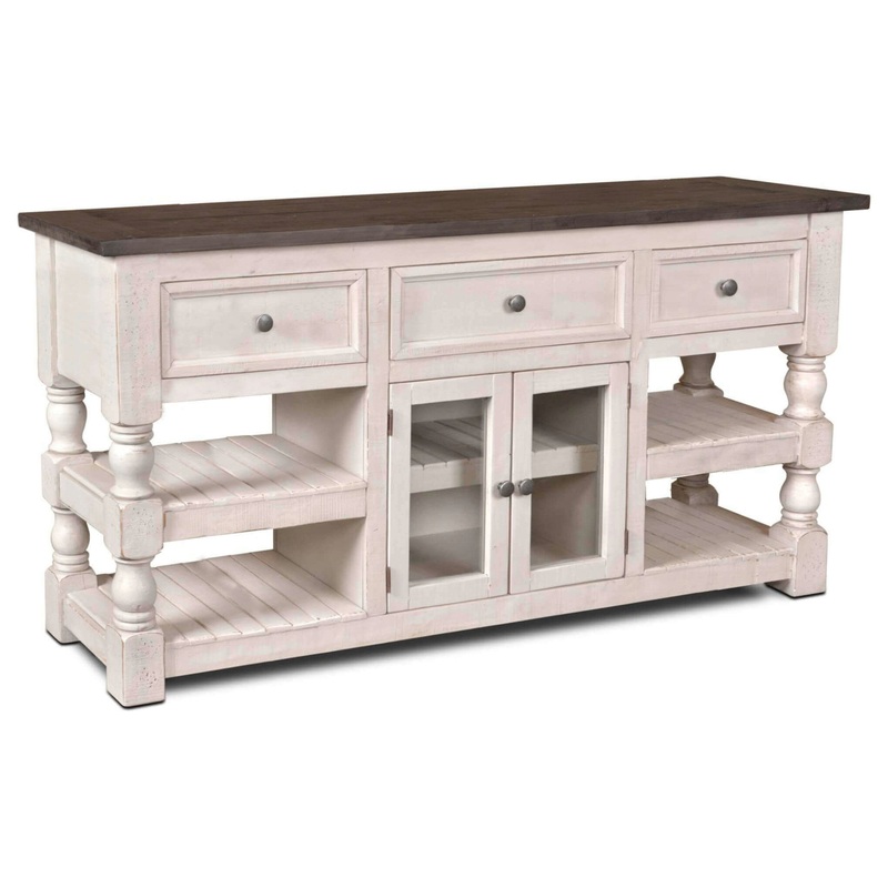 Sunset Trading Stowe Barn Door Console – Media Cabinet – TV Stand – Rustic White and Brown Solid WoodHH-2750-070 Sunset Trading Stowe Barn Door Console | Media Cabinet | TV Stand | Rustic White and Brown Solid Wood, This industrial inspired entertainment console works whether you have a traditional home with things to store, in need of uncluttering your dining room or prop a 70 TV and catch the latest score. Barn door style furniture offers the rustic warmth of a modern farmhouse. Western rustic sideboard showcases two sliding doors to cover two shelves on each side or expose a spacious cabinet in the middle. Crafted from solid pine wood, contrasting forged iron hardware make it ideal to pair with a round distressed metal wall mirror for a contemporary vibe. Perfect in your foyer to hold shoes, hats and scarves. Fully assembled solid wood construction | Rustic finish with wood knots and natural variations so each cabinet is unique shelves | Framed with secure, nailed, industrial inspired forged iron accents | Black metal adds urbane contrast | Constructed from solid kiln-dried Monterey Pine | Eco-friendly, water based stain and sealers bring out the beauty of the natural wood grain | Sustainable wood sourced from responsible foresting that are safe for the environment and human beings | Strong plastic inserts keep your tile and wood floors protected | DIMENSIONS: Overall: 36?H x 17 ?D x 60?W | Metal track: 58W | End shelves (4): Top 16?H x 14.75?D x 15.75?W, bottom 13?H x 14.75?D x 15.75?W | Center shelves (2): Top 16?H x 14.75?D x 23?W, bottom 13?H x 14.75?D x 23?W | Shelf thickness: 2 | Media hole: 1.5 | Top thickness: 1.25? | Front overhang: 1.25 | Feet: 2?H x 1.5?D x 2.75?W | Weight: 95 lbs.. Made in Mexico