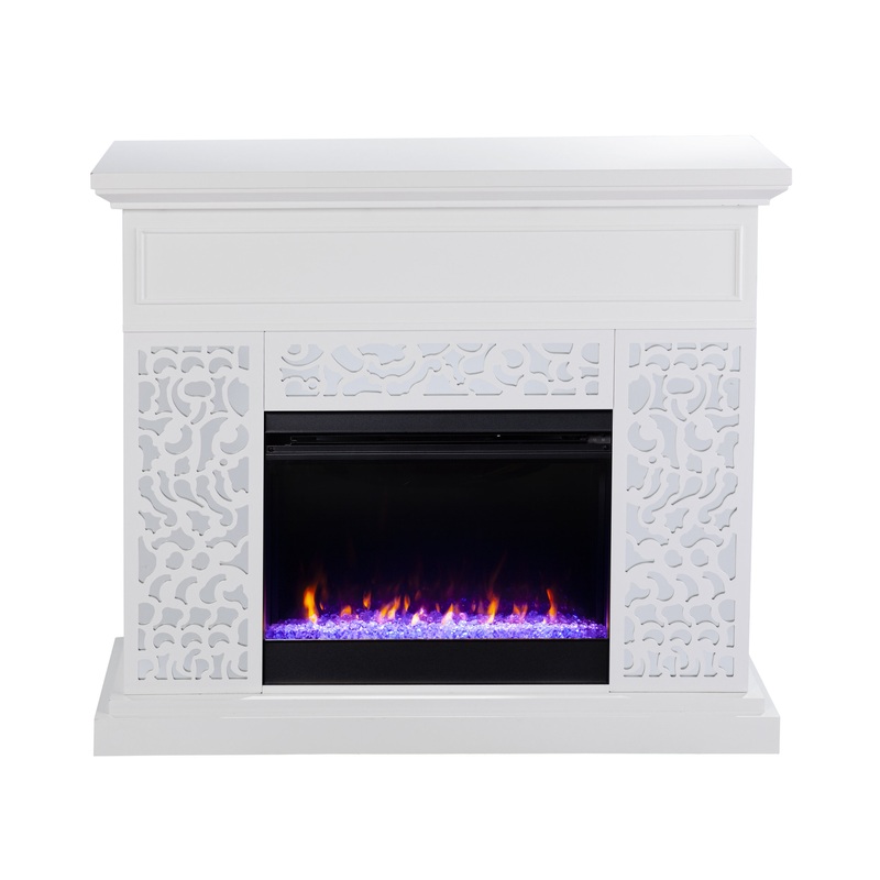 Add a touch of modern to your Decor this electric fireplace. A spacious mantel displays framed photos or a vase of flowers, while unique, lattice-inspired details highlight the mirrored surround. Shimmering faux crystal adds ambiance flickering LED flames,