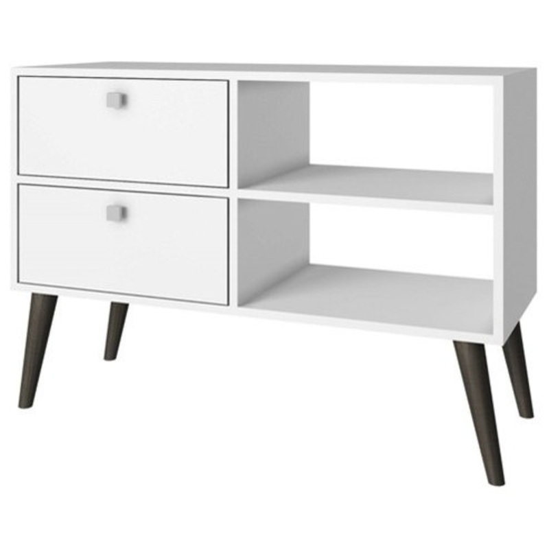 If you’re looking for a TV stand that’s both fresh and functional, look no further than this White Grey Wood Modern Classic Mid-Century Style TV Stand Entertainment Center. With splayed legs and square drawer pulls reminiscent of Scandinavian design, this TV stand offers ample storage with its two drawers and two open-back shelves. Crafted of high-quality medium density particleboard in your choice of two-tone finish.