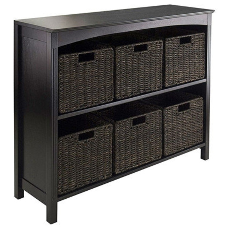 This spacious Espresso 3 Tier Bookcase Shelf Dresser with 6 Storage Baskets is ideal for displaying your treasures, storage, dresser, kids room, or your books. Simple and elegant design is a perfect additional to any home. Comes with 6 Corn Husk Foldable B