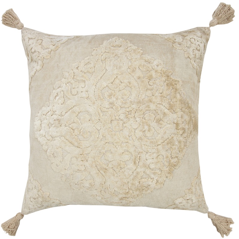 -TIMELESS AND TRADITIONAL: Enhance your home with this soft textured throw pillow. This accent features a fanciful medallion and bordering applique design with coordinating corner tassels.