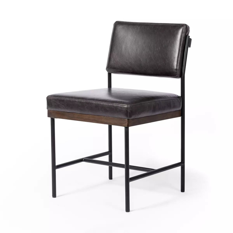 Bring a luxe, modern look to the table. Slim, black-finished iron forms an airy frame for black top-grain leather, with solid oak decking for an eye-catching material mix.