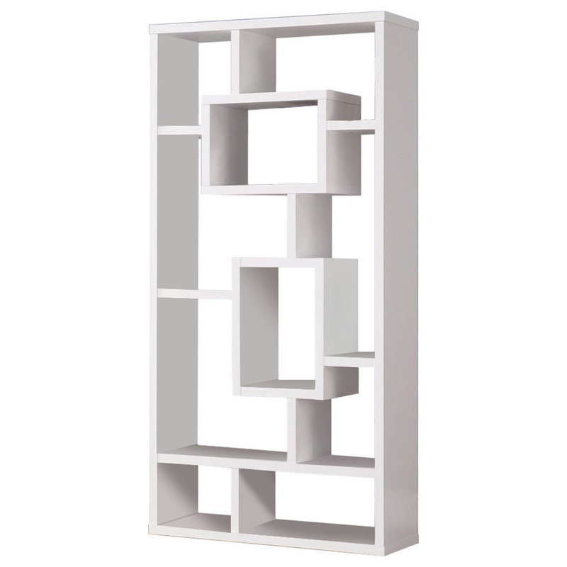 The popular architectural inspired bookcases have made bookcases fashionable again. The geometric compartments on this piece create a varied space to display and store items. Two center rectangular compartments attract the eye and are great spots to highlight your favorite decor. This book case offers great storage option for compartmental organization and different size items. The open back is a nice feature to use this shelf as a divider with two-way display. The white finish is casual, fresh and versatile.