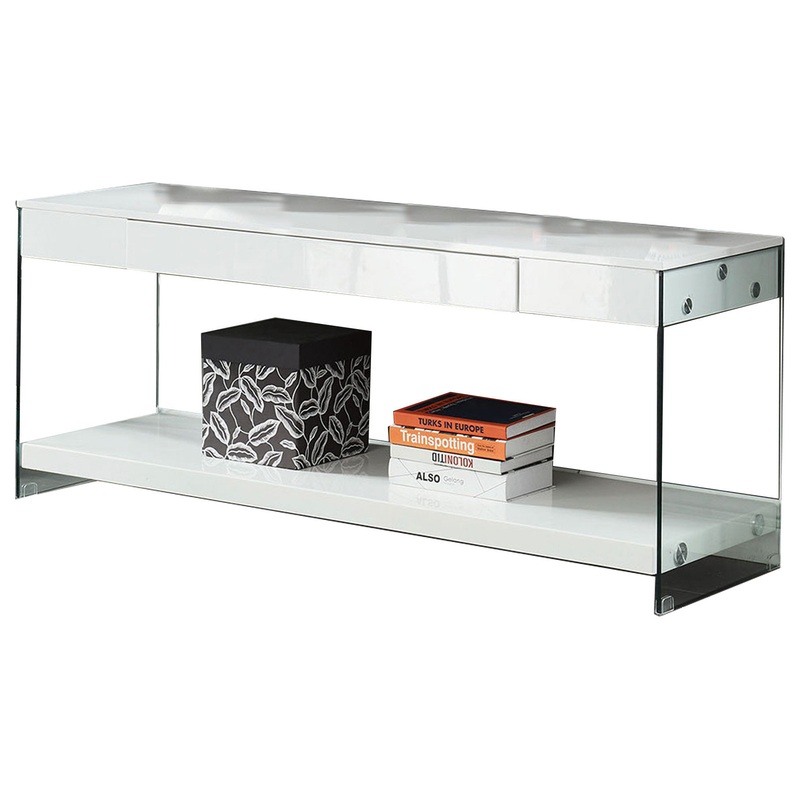 Add to your sleek, modern entertainment space this TV Stand. A rectangular, smooth design constructed of wood and glass gives you a clean, contemporary look that is enhanced by it's white finish. Two drawers give you plenty of enclosed storage space, while