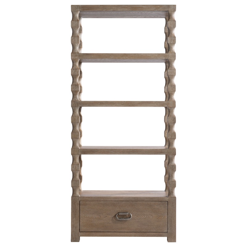 The Aventura etagere is highlighted by uniquely shaped cast resin posts that support three fixed shelves and one shelf surface. A bottom drawer with metal tab pull adds storage. The open-back shelving design is finished in a warm and rustic Marcona.