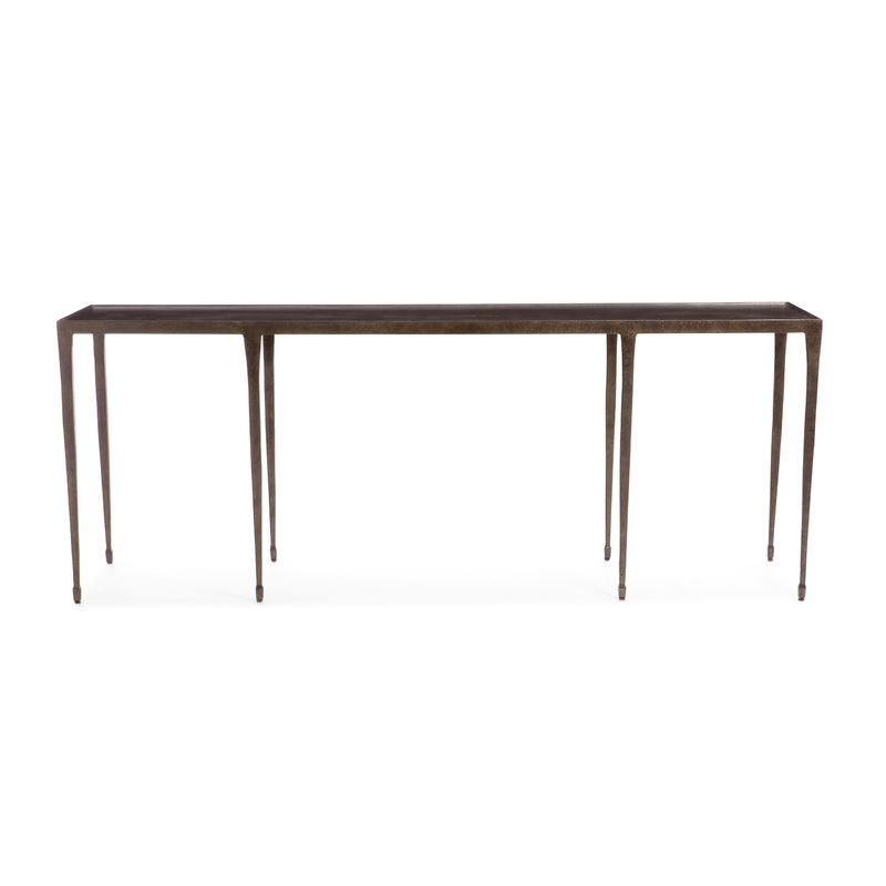 Hammered iron table in blackened finish. Adjustable glides. Model # (MPN)323913Product ID178840412Manufactured ByBernhardt Furniture CompanySold ByHouzzSize/WeightW 84" / D 19" / H 32" / 155 lb.ColorBlackenedMaterialsHammered cast ironAssembly RequiredNoCa