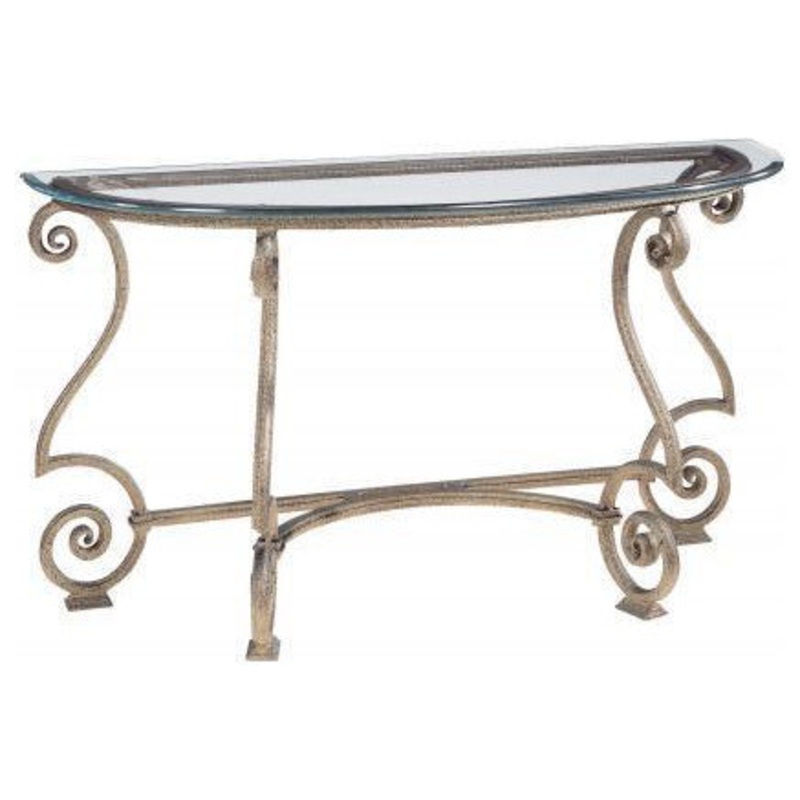 The Solano Console Table by Bernhardt has a very eclectic look with its shaped cast iron base with a braid trim. The Aged Bronze finish gives this cocktail table a rustic look that will have your interior looking extraordinary. This one is complimented by a glass top with a shaped dupont edge.