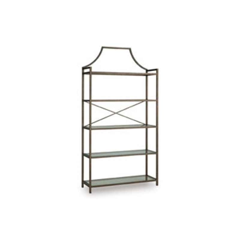 Classic design effortlessly blends with modern functionality in this elegant bookcase. Its antiqued bronze-tone finish adds a touch of warmth and sophistication, while the clear glass shelves create an airy and spacious feel. Its exactly what youve been searching for to display your treasured books, digital picture frames or decorative accents.