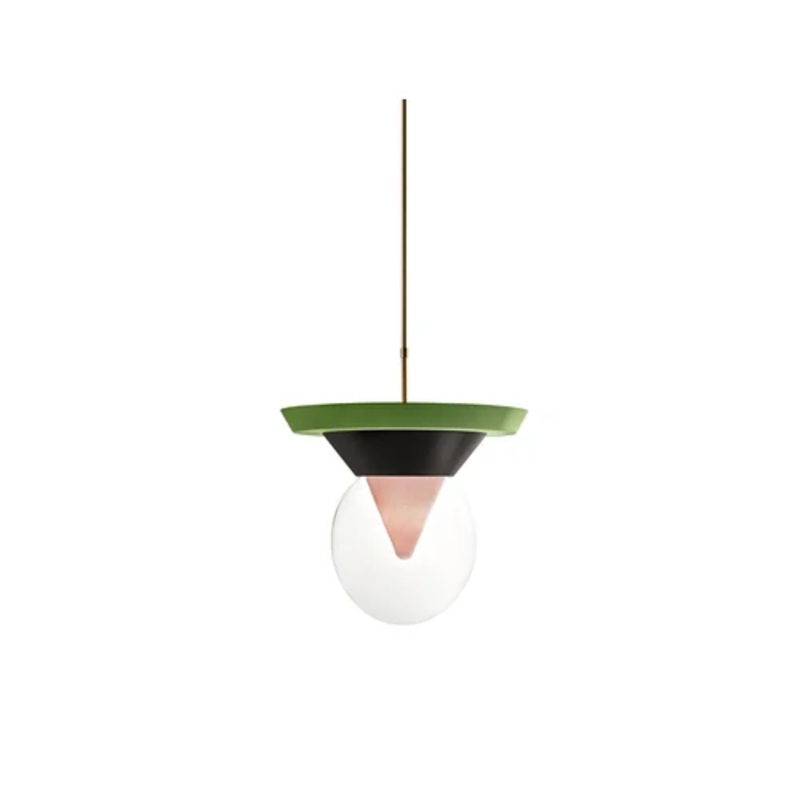 The Bia suspension lamp seamlessly merges robust materials with aesthetic finesse. Crafted from transparent glass, its unique funnel shape allows light to dance gracefully within, accentuated by a delicate pink hue. Complementing the glass, the lamp boasts elements of dark green matte-painted ceramic and light green lacquered wood. These components not only provide structural support but also enhance its visual impact. A gold-silver toned iron suspension tube elegantly secures the piece, offering variable hanging lengths to suit diverse settings.