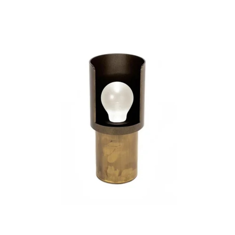 Bianca is a singular table lamp made with a cylindrical base in textured burnished brass, small 60mm satin-finished reclaimed bulb, painted aluminum louvre and a LED source with push-button dimmable.