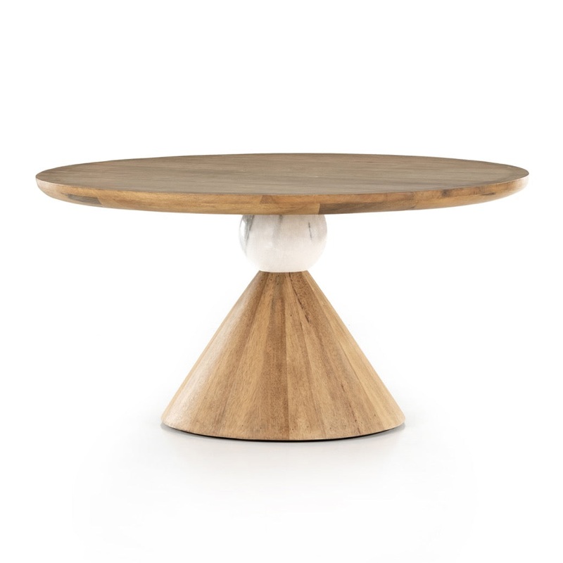 A sculptural showstopper inspired by Italian design. Finished in a smoked honey, a cone-tapered parawood base supports a roomy, rounded tabletop separated by honed white-finished marble detailing. Seats four to six comfortably.