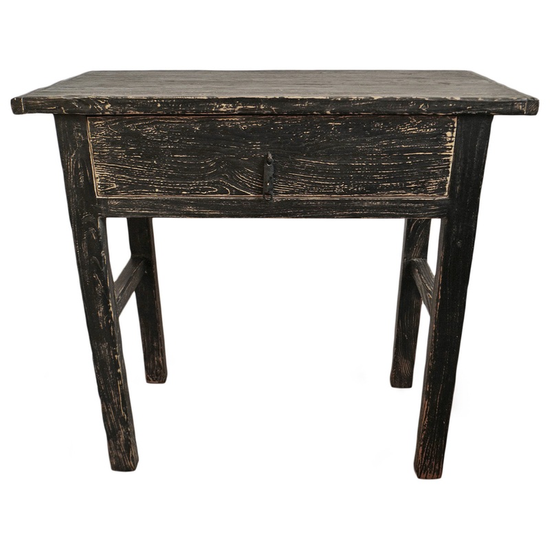 Simple rustic black village console, entry table, or bedside table. Aged black finish on solid wood which highlights beautiful natural wood grain. Includes one drawer for storage. Great rustic modern farmhouse piece with a variety of uses. Product ID201000