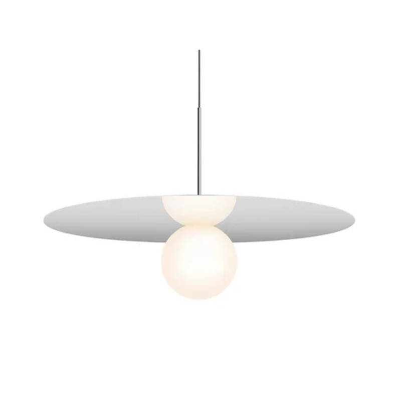 Bola Disc is a uniquely expressive LED Pendant system featuring a distinctive range of chromated disc reflectors that give the illusion of weightlessness by mirroring its surroundings. Available in 4 distinct sizes 12(30cm), 18(46cm), 22(56cm), 32(81cm), Bola Disc pairs an elegant globe diffusor made of opaline glass with exquisitely polished stainless steel or aluminum discs in chrome, brass, rose gold and lacquered white to appease the most discerning tastes. Dependent on size, Bola provides up to 1200 lumens of warm ambient light and is fully dimmable, providing unparalleled illumination. Bola can be suspended individually, in series, or as striking chandelier groupings for residential, contract, and hospitality settings alike.