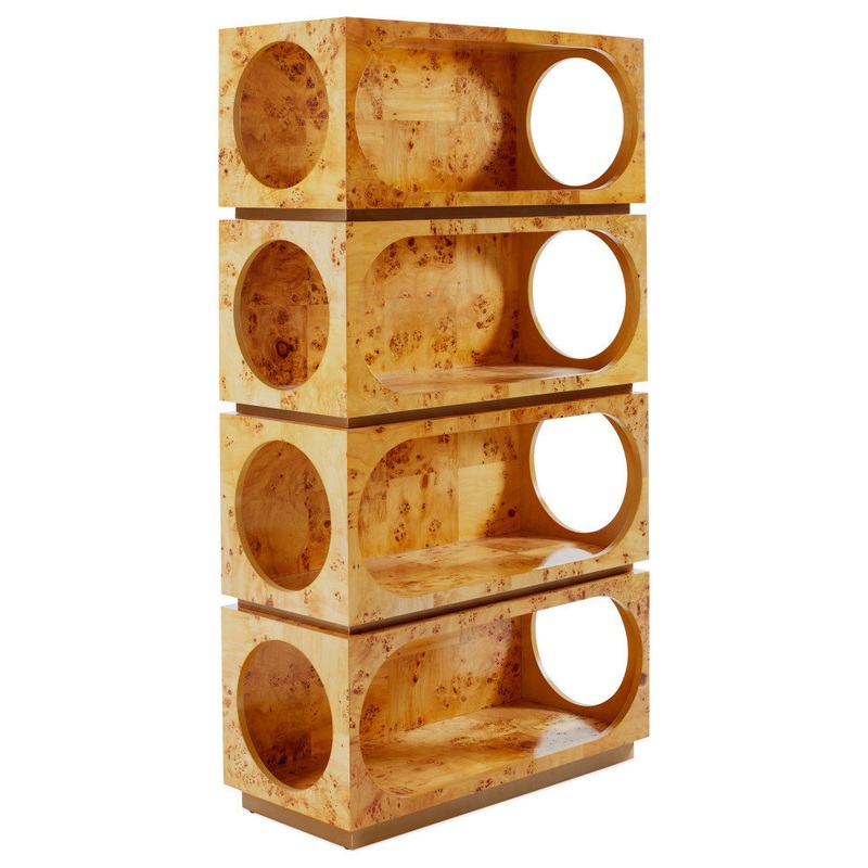 Architectural rigor meets the warmth of burled wood. Our Bond tagre features pieced mappa wood shelves with capsule-shaped cut outs in the front and circular cut outs on the sides, each with antique brass reveals. Its petite scale makes for a natural fit in any space. Perfect for piling on personal artifacts, daring dcor, books and blooms. For extra credit, flank your new favorite focal point with pairs of chairs and art.