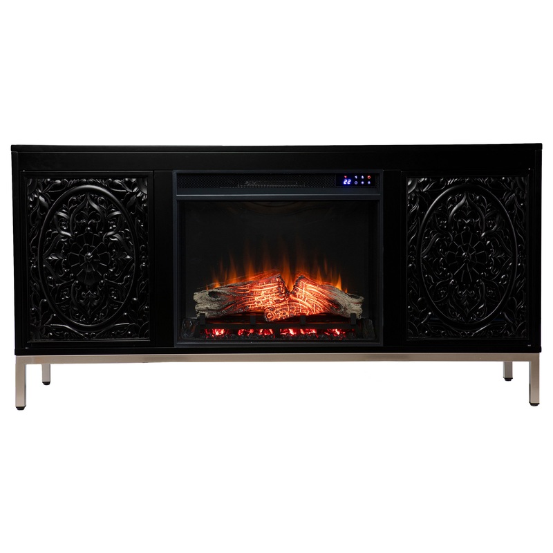 Bring home comfortable warmth and modern style this electric media fireplace. Carved wood doors add depth and texture while two spacious cabinets tuck away movies and games. Flickering LED flames and adjustable heat settings create cozy ambiance in your space, functioning or out heat for year-round enjoyment. Turn evenings at home into a relaxing event when you add this fireplace media stand to your living room or open concept living space.