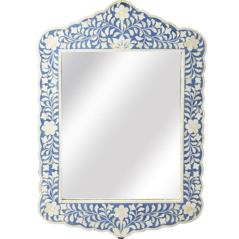 This magnificent Wall Mirror features sophisticated artistry and consummate craftsmanship. The botanic patterns covering the piece are created from white bone inlays cut and individually applied in a sea of blue by the hands of a skillful artisan. No two mirrors are ever exactly alike, ensuring this piece will hang as a bonafide original.
