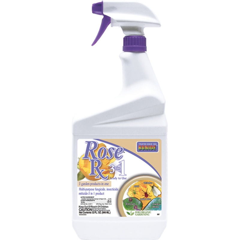 Bonide Rose Rx 3-In-1 Ready-to-Use Spray is an easy, ready-to-use formula that acts as a miticide, fungicide and insecticide. It kills black spot, powdery mildew, rust, blights, spider mites, aphids, whiteflies and other insect pests at all stages of life.