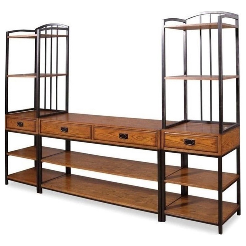 Reminiscent of this piece marries a traditional, multi-step distressed Oak finish on poplar solids and oak veneers with new age, brown metal accents. With four storage drawers and six fixed shelves, the Gaming Entertainment Center provides much needed storage space in an entertainment space. Three piece set includes the gaming entertainment center and two media towers.