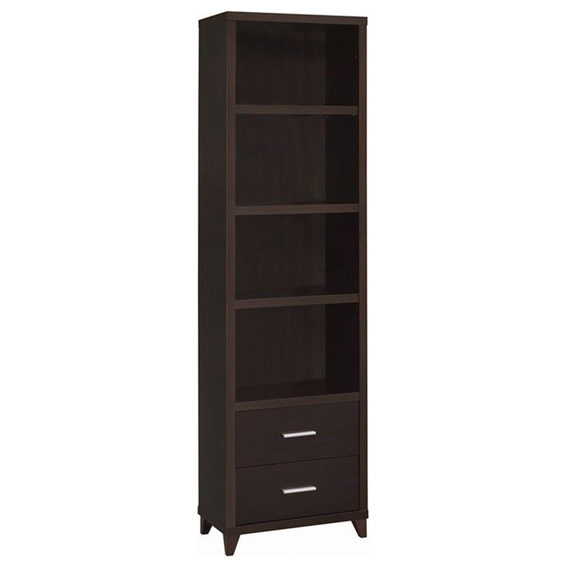 Enhance your living space with contemporary elegance. Smooth, sleek lines and brushed silver hardware enhance the accentuate the style of this stunning bookcase. Four large open compartments provide ample shelf space to display books, art, photos, or games. Its sturdy shelves are conveniently adjustable for extra versatility. Complete with two spacious lower drawers, this unit offers plenty of storage space for all your home entertainment essentials.