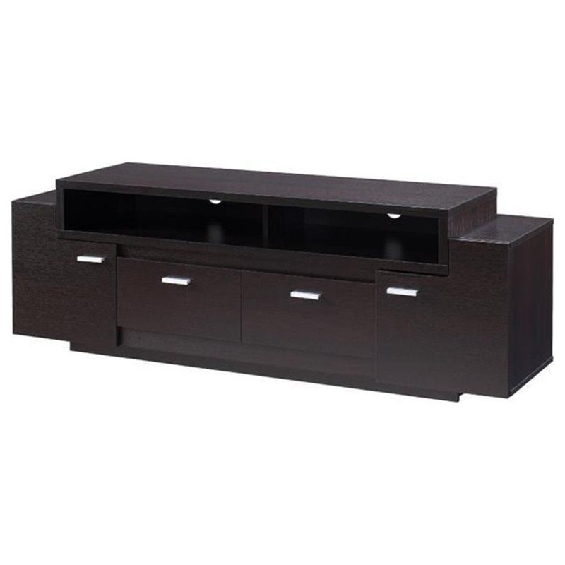 Features: -Finish: Cappuccino -Materials: Wood, Veneers -Sturdy wood frame for lasting quality -Sleek modern design with multi-level top surface -2 open shelves with rear wiring access -2 drawers on double metal glides -2 cabinets with T-bracket hinges -Me