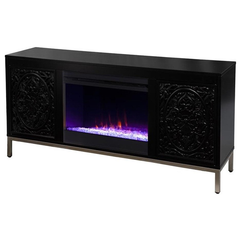 Bring home comfortable warmth and modern style with this electric media fireplace. Carved wood doors add depth and texture while two spacious cabinets tuck away movies and games. Shimmering faux crystal adds ambiance with flickering LED flames, alternating colors, and lifelike embers, all from the convenience of your sofa. Turn evenings at home into a relaxing event when you add this fireplace media stand to your living room or open concept living space.