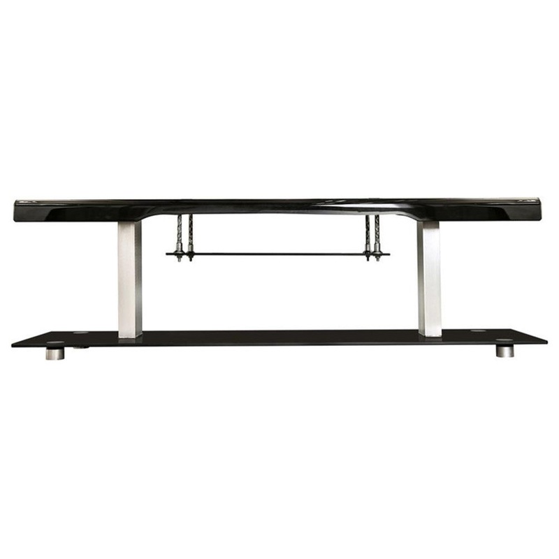 Take your TV watching to the next level with this contemporary metal TV console! The spacious top is composed of 10mm-thick tempered glass and is designed to support a TV that is 60-inches wide without issue. A hanging shelf beneath the tabletop creates the perfect place to position your media devices or gaming consoles for easy access at all times. The wide glass base creates even more storage space for speakers or other media players and rests atop sturdy chrome feet. This pieces black glass design creates a modern appearance that adds panache to your living room space.