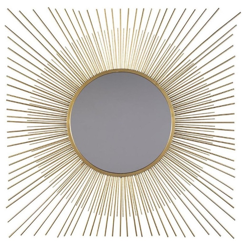 The accent mirror is a contemporary musing. Breathtaking sunburst design shines in goldtone metal. Beautifully large scale makes this piece the center of attention. Features: -Finish: Gold -Material: Mirrored Glass, Metal Frame -Keyhole bracket hanger -Cle