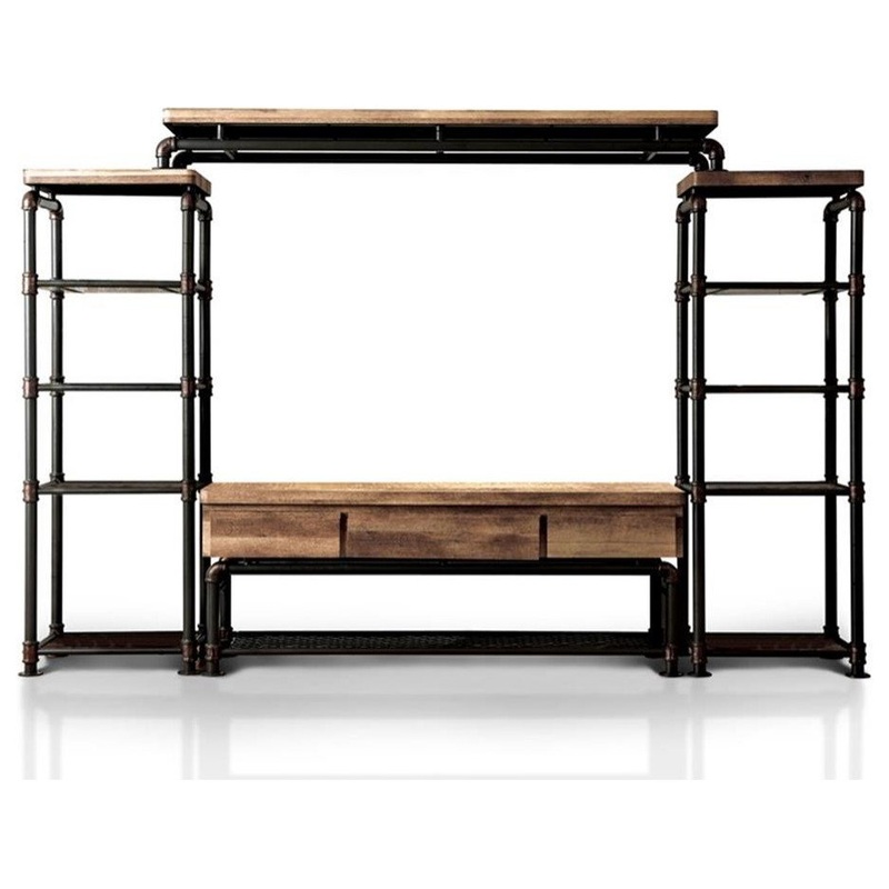 Instill a bit of industrial flair into your home with this 4-piece antique black metal, a pipe-inspired TV set that features natural tone finished wood and hand-painted copper accents. The wire mesh shelves provide eye-catching appeal and useful storage fo