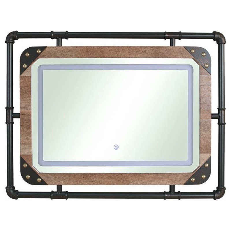 Take your decor to the next level with the modern features and classic industrial design of this rectangular metal wall mirror. It captures attention with a mixed material brown wood finish MDF and sand black steel frame that delivers rich details and dimensionality. A lighted border in the mirror ensures clarity and the best view possible, making this a perfect choice for a bath or dressing space.
