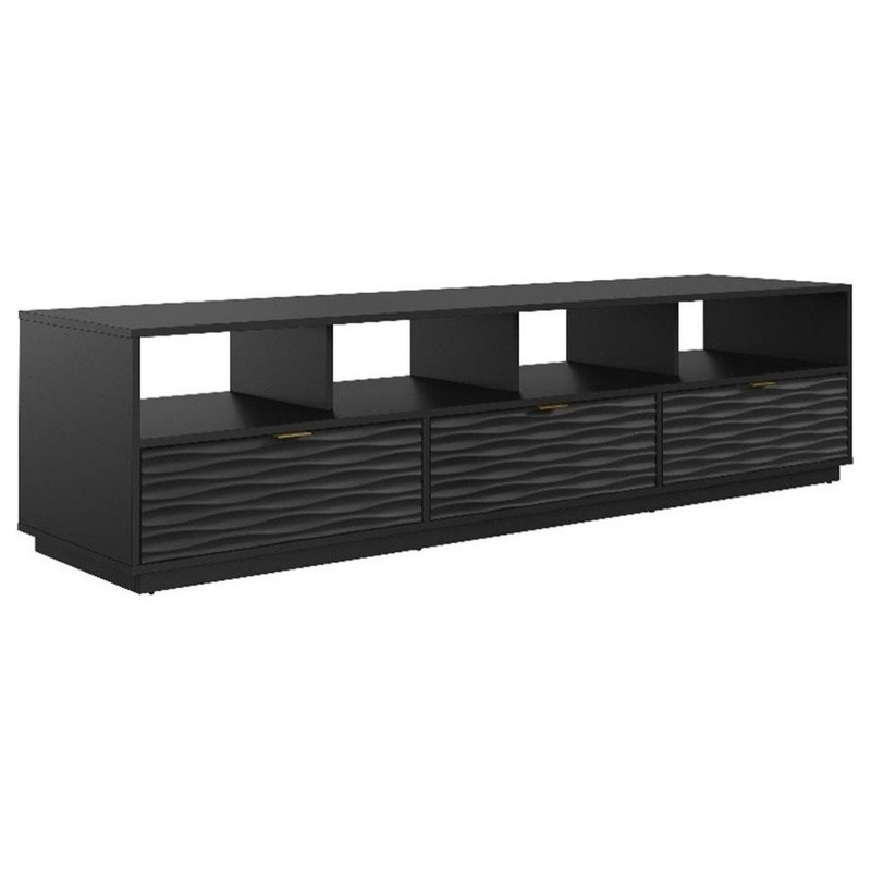 Whether you are looking for a large TV stand or a credenza with multiple functions, this entertainment credenza from the Bowery Hill Select collection offers that, and more. This TV stand with drawers can accommodate up to an 85″ TV weighing 135 lbs. or less, making it the perfect spot for gathering around with friends. Featuring three large drawers on metal runners and safety stops, this 3-drawer TV console can hold board games, remotes, pillows, or blankets as well as general storage for your living room, guest room or den. Divided shelving in this media credenza offers organized space for gaming consoles, DVD players, home dcor and photos of your family. Finished on all sides for versatile placement, this tv credenza will look polished from every angle. The drawer fronts feature a decorative wave pattern that creates a sense of ease and visual depth, while the Black finish and metal hardware offer a grounded feeling, making for a well-rounded addition to your home.