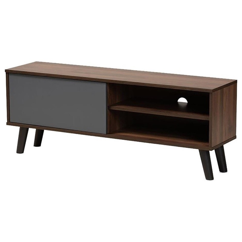 Displaying contemporary design motifs, the Bowery Hill TV stand modernizes any space. Made in Malaysia, the Bowery Hill is comprised of sturdy wood showcasing a two-tone finish of walnut brown and gray for a cool, modern look. Two external shelves and one additional shelf behind the door to provide easy storage for all your living room essentials. Requiring assembly, the Bowery Hill is also equipped with a cord management hole to easily connect your media devices. Angled legs lend a chic mid-century touch. A fantastic blend of modern design and utility, the Bowery Hill TV stand enhances any space.