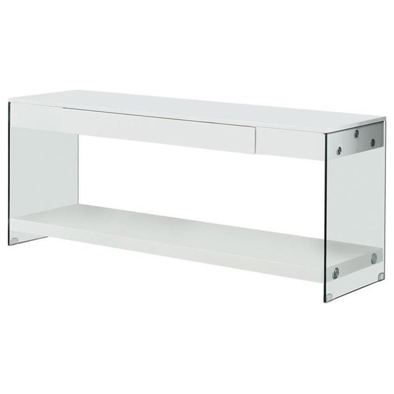 Make an urbane upgrade to your home entertainment suite with this modern Glass Top 70-inch TV Stand from Bowery Hill in white finish. With the sophistication of a high-tech, yet no-fuss media center, the TV stand features a pair of sturdy tempered glass panels that support its minimalist aesthetic for a sleek look that helps open up the room.