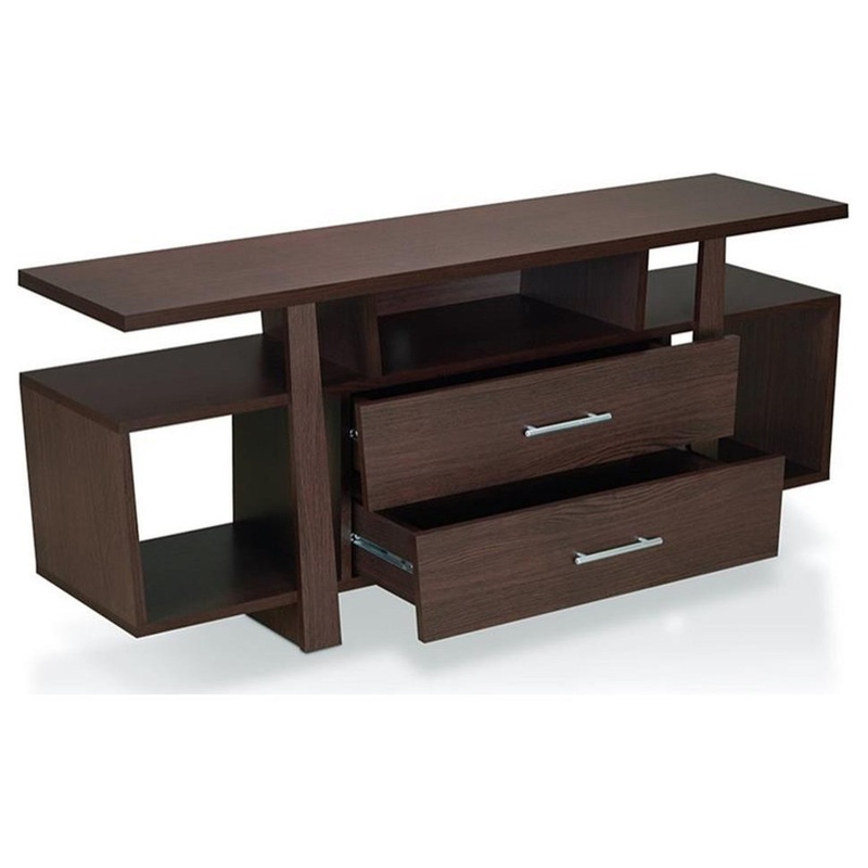 The TV stand in an espresso finish features a streamlined, modern design that helps create an airy, open aesthetic. Use the Wood TV stand's wide tabletop to showcase your modern TV while various sized shelves help store all your entertainment devices. Cent