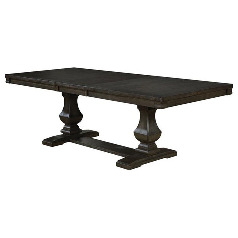 This transitional rectangular wood dining table from Bowery Hill collection casts a strong presence ideal for any well appointed dining space. It’s crafted with a gorgeous rich espresso finish from solid wood and seats up to 8 comfortably with the included 18 inch drop leaf. The double pedestal trestle base makes for this dining piece a handsome sturdy silhouette.