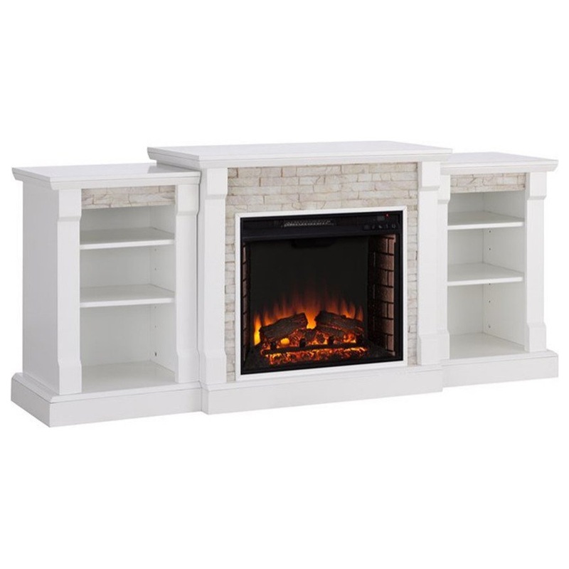 Set your heart aflame with this lodge inspired electric fireplace. Bookcase storage shelves media, novels, or tchotchkes. Crisp white melds with white simulated river stone for a rustic touch on this traditional fireplace silhouette. Low profile and wide scale, this electric fireplace with bookcases turns on chic style beneath your wall mounted TV in the living room or as a sleek buffet in the dining room. True to life. This electric fireplace saves energy with long-lasting, cost-effective LED bulbs, while igniting ambience with realistic flames and supplemental heat. No professional installation required, simply plug into any standard outlet. Control from your favorite easy chair with the easy-to-use remote control. When you crave the look, but not the heat, turn on just the flames and enjoy year-round!