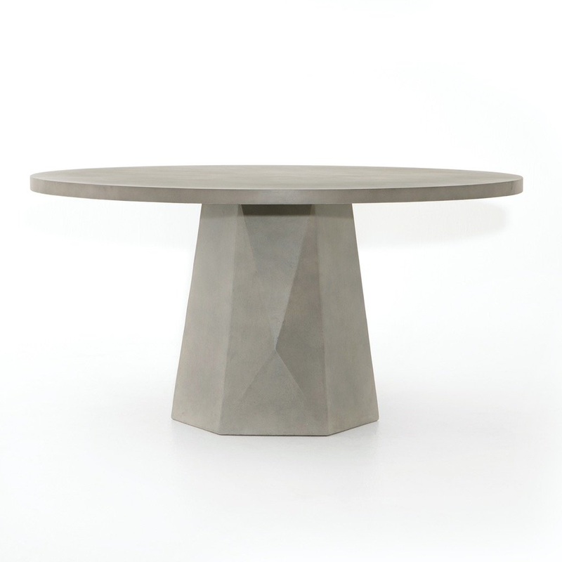 Concrete forms a faceted base for impact from every angle. A roomy, rounded top is ready to welcome guests indoors or out. Cover or store inside during inclement weather and when not in use.