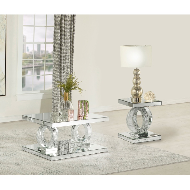 Transform your living room with this glamorous mirrored coffee table set. Featuring bases of interconnected dual rings adorned with dazzling acrylic crystals, every surface is wrapped in sleek mirrored panels with softly beveled edges. Designed to exude Ho