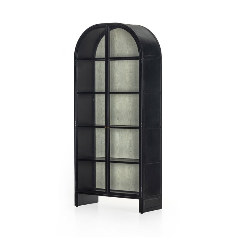 Store it in style. Made from black-finished iron, beautifully arched cabinetry features glass-front doors, ideal for storing and displaying favorite books, photos, keepsakes, and more.