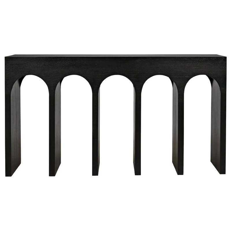 Bridge Wood Black Console Table This stunning console takes its design inspiration from suspension bridges. Its graceful arches add interest without overwhelming, and its hand-rubbed black finish maximizes the mahogany’s beauty,