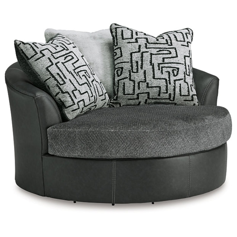 Appeal to your eye for ultra-contemporary design with this oversized swivel chair. Chic and sleek in dark neutrals, it pairs cozy fabric with faux leather for invitingly cool character. And with its robust size offering extra seating space, you can chill out in comfort and style.