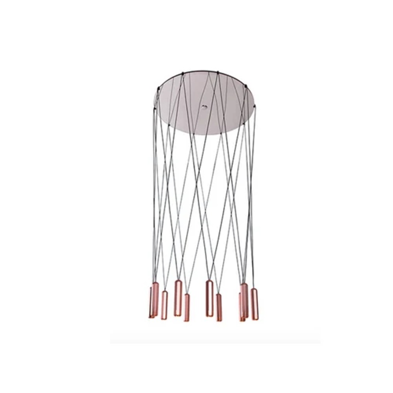 The beautiful lamp Brixton is a spot pendant inspired by the Victorian railway and residential architecture of south London. Designer James Bartlett took the octagonal turrets that appear on buildings in the area as the starting point for this design, which has a strong engineered aesthetic. In the Spot Cluster, Brixton pendants are suspended around a circular disk. The clusters can be arranged in various patterns to give different design options. Arranged as a down-lit cluster chandelier, the cords themselves criss-cross to create decorative geometric patterns.