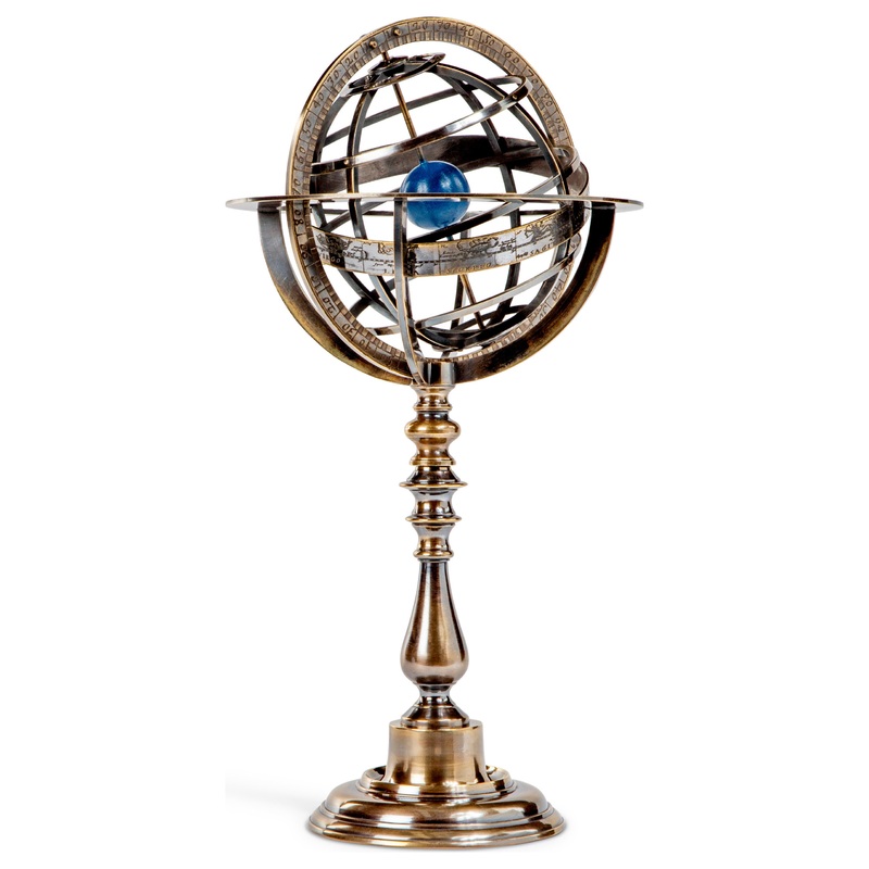 Decorate your home with the eye-catching Bronze Armillary Dial. Featuring a curved base and solid bronze framework, this elegant piece depicts a blue Earth at the center of the surrounding planets. The wide ecliptic circle band shows the trajectory of the