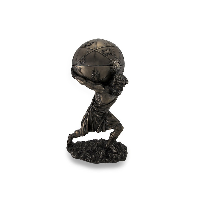 -11 1/2 in. High, 5 in. Wide, 7 in. Deep -Expertly Cast in Resin -Amazing Metallic Aged Bronze Hand-Painted Finish -Incredibly Detailed -Sphere Doubles as a Storage BoxIn Greek mythology, Atlas was the Titan who held up the celestial sphere, and the Titan