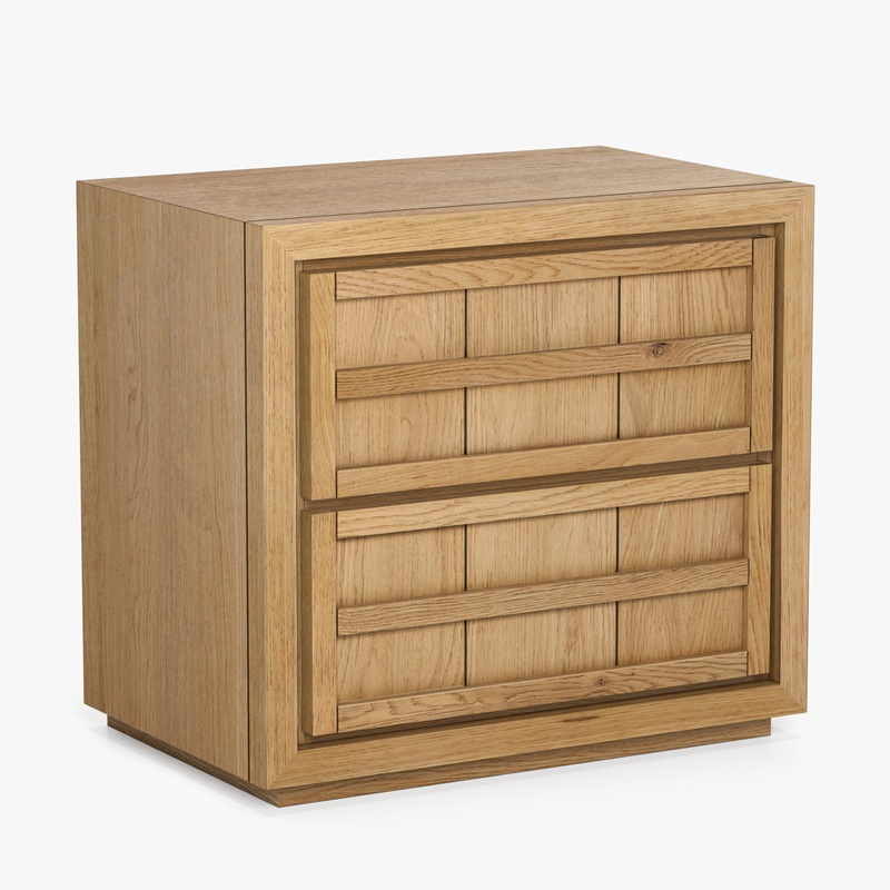 The Buddy nightstand combines the beauty of natural oak wood with a textured finish achieved through a wirebrushing technique that showcases the depth and character of the wood grain. Ample storage is provided by 2 large drawers with soft closing hardware, with the drawer fronts featuring a windowpane inspired detail.